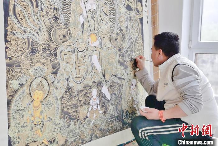 圖為桑杰加畫(huà)唐卡。韓麗 攝