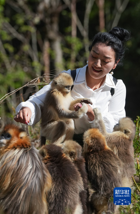 4月26日,在四川白河國(guó)家級(jí)自然保護(hù)區(qū)里,工作人員與川金絲猴在一起。新華社記者 江宏景 攝