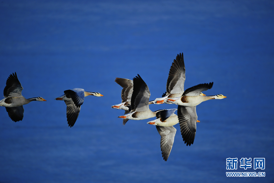 在青海湖畔,一群斑頭雁振翅翱翔。