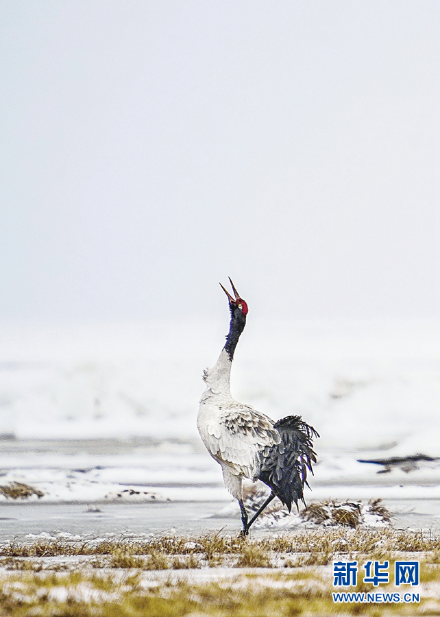 在青海湖畔,一只黑頸鶴正翩翩起舞。