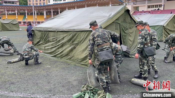 記者10日從四川省阿壩州委宣傳部獲悉,6月10日凌晨,四川阿壩州馬爾康市多次地震發(fā)生后,武警四川總隊(duì)阿壩支隊(duì)第一時(shí)間趕到震區(qū)周邊居民密集區(qū)域,擔(dān)負(fù)搭建安置點(diǎn)、安撫群眾、巡邏執(zhí)勤等任務(wù)。今天清晨五點(diǎn),災(zāi)區(qū)又出現(xiàn)降雨天氣,武警官兵們?cè)隈R爾康市城區(qū)應(yīng)急避難場(chǎng)所,緊急搭建帳篷。