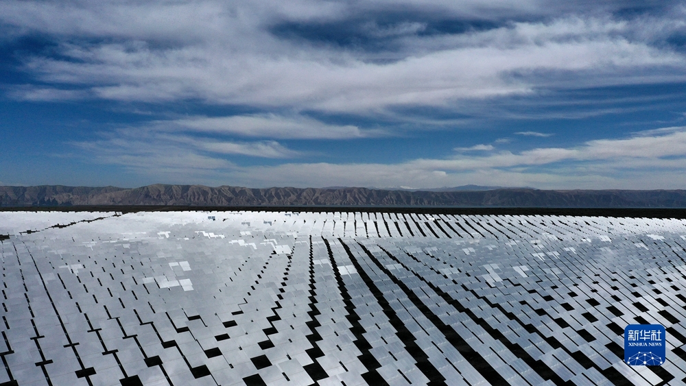 陽(yáng)光照射蔚藍(lán)的電池板,光能便轉(zhuǎn)化成源源不斷的電能;風(fēng)力發(fā)電機(jī)的葉片迎風(fēng)飛轉(zhuǎn),風(fēng)被“捕捉”進(jìn)一條條輸電線(xiàn);百米高的吸熱塔和“鏡子海洋”組成熔鹽塔式光熱電站,科技感與綠色減碳有機(jī)結(jié)合……