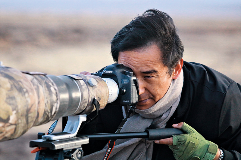 夕陽(yáng)西下,大風(fēng)肆虐。49歲的才項(xiàng)南加系上圍巾趕忙下車,從后備箱包裹嚴(yán)實(shí)的毛毯里拿出相機(jī)和三腳架,稍做調(diào)試后,便扛著裝備三步并作兩步地趕往200米外的一片濕地?!摆s緊去看看,兩只黑頸鶴在喝水呢!”他說(shuō)。