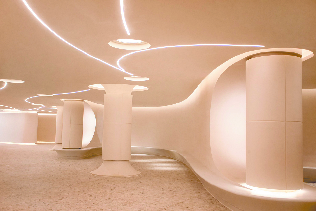 “看見(jiàn)九寨”大樓內(nèi)的10余個(gè)空間里,設(shè)計(jì)團(tuán)隊(duì)用不同的色彩和科技表現(xiàn)手法表達(dá)出不同的舒緩風(fēng)格,治愈人心?!蔼?dú)自醒來(lái)”藝術(shù)館運(yùn)用弧形和曲線,將空間切割出曼妙的身形,輕盈靈動(dòng),淺黃柔色的燈光彌漫著溫柔氣息;以白色調(diào)為主的“九寨時(shí)光”圖書館,能讓人從浮躁中快速安靜下來(lái)。