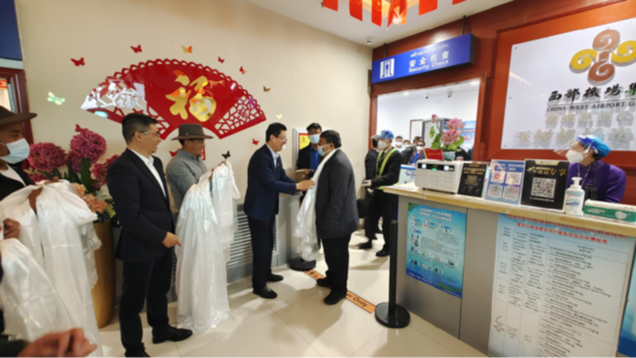 玉樹州委常委、副州長、指揮部黨委書記、指揮袁浩宗,州委常委、組織部長薛亞軍,州委組織部常務副部長陳有軍,副部長邴巴扎西,副部長、指揮部黨委委員王家兵在機場大廳迎接,并第一時間為北京市第五批援青干部人才及送行團成員獻上了飽含玉樹各族各界干部群眾深情厚誼的哈達,與他們一一握手,向大家的到來表示熱烈的歡迎。