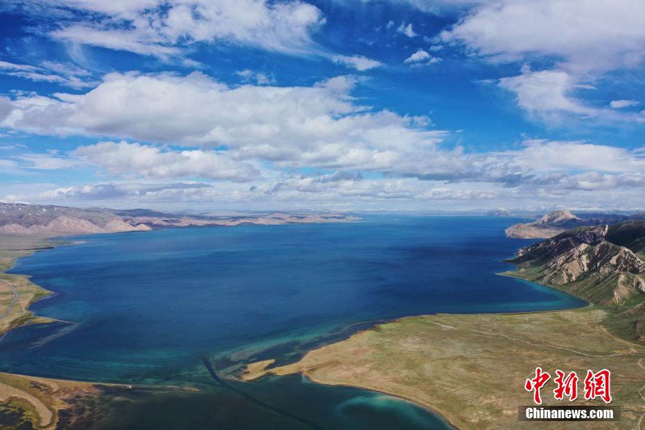 冬格措納湖位于青海省果洛藏族自治州瑪多縣,是一片地處海拔4100多米的淡水湖。夏日的冬格措納湖,湖水湛藍,宛如跌落群山之中的“藍寶石”。紅、黃、綠色的草灘與湖水相互映襯,美景如畫。圖為航拍冬格措納湖美景。 馬銘言 攝