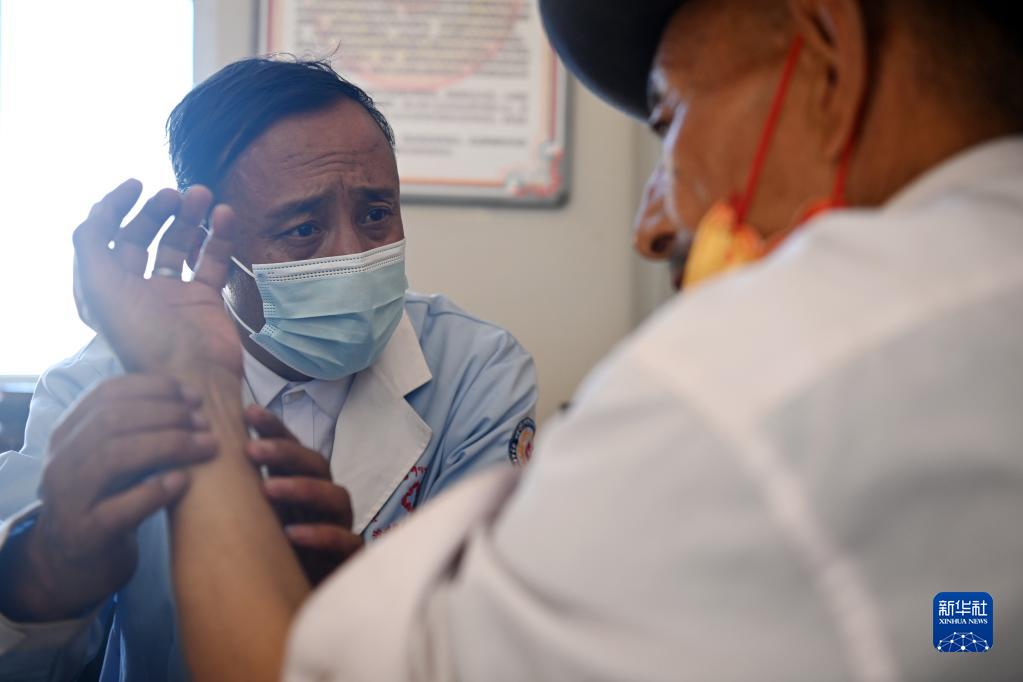 在治多縣索加鄉(xiāng)衛(wèi)生院,布久索南更青為患者把脈(8月11日攝)。新華社記者 范培珅 攝