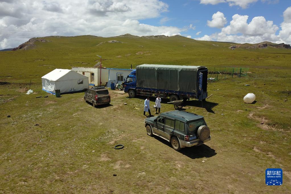 在治多縣索加鄉(xiāng)當(dāng)曲村,布久索南更青(左)和同事一起前往牧民家中問(wèn)診(8月11日攝,無(wú)人機(jī)照片)。新華社記者 范培珅 攝