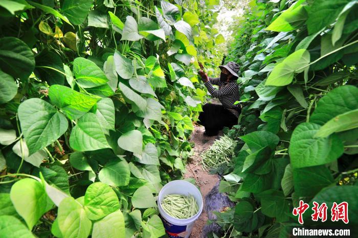 熱布卡蔬菜基地大棚內(nèi),工人正在采摘四季豆。王磊 攝
