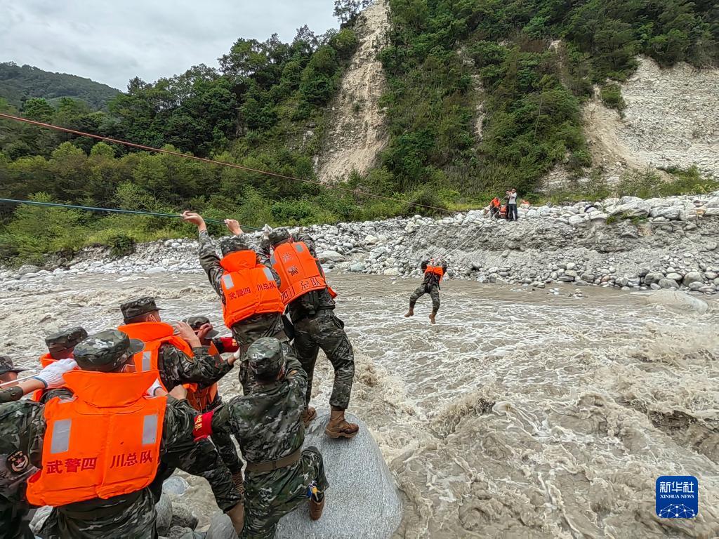 9月6日,武警四川總隊(duì)甘孜支隊(duì)救援官兵在瀘定縣磨西鎮(zhèn)通過繩索前往河對岸,救助被困群眾。新華社發(fā)(張文軒 攝)