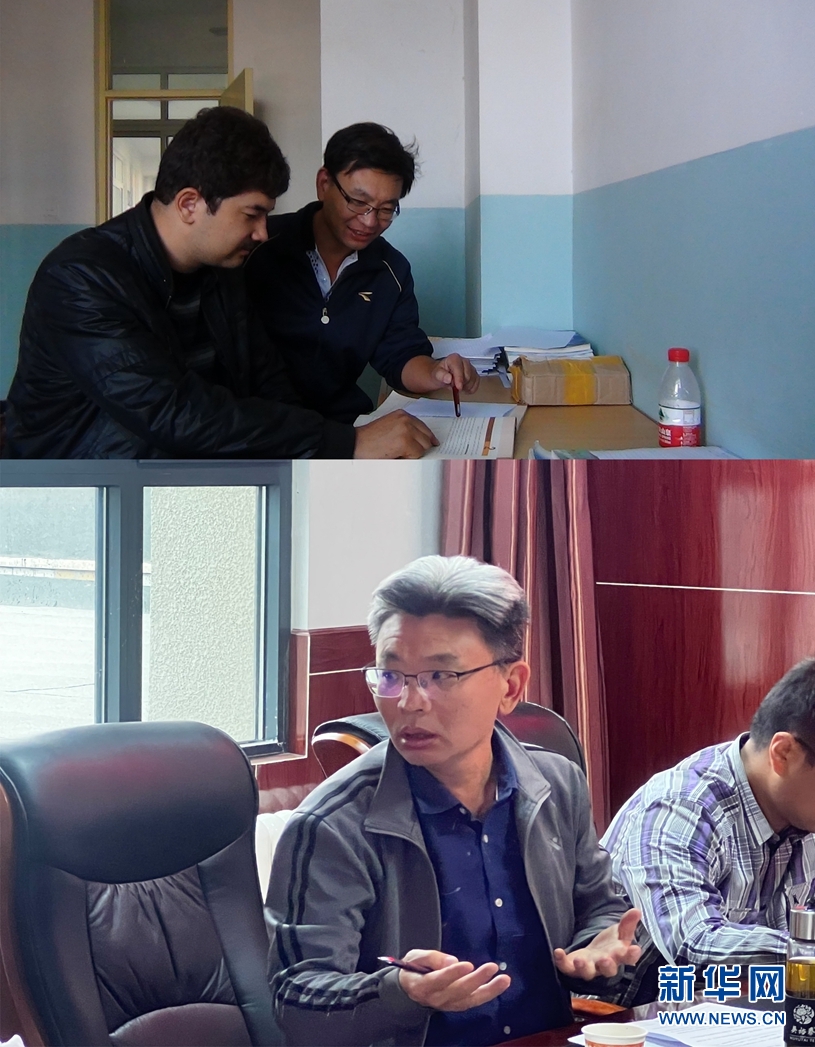 這是一張拼版照片:上圖為2014年6月23日,趙焱(右)與和田縣第二中學(xué)青年教師一起交流(新華網(wǎng)發(fā) 受訪對(duì)象供圖);下圖為2022年3月31日,趙焱(左)在玉樹(shù)州教育局參加玉樹(shù)州高三備考會(huì)。(新華網(wǎng)發(fā) 受訪對(duì)象供圖)