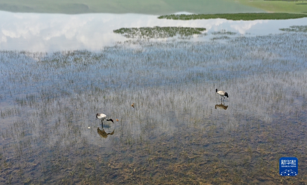 這是位于青海省海北藏族自治州門源回族自治縣鴛鴦花海濕地中的黑頸鶴(2022年6月24日攝,無人機照片)。新華社記者 李占軼 攝
