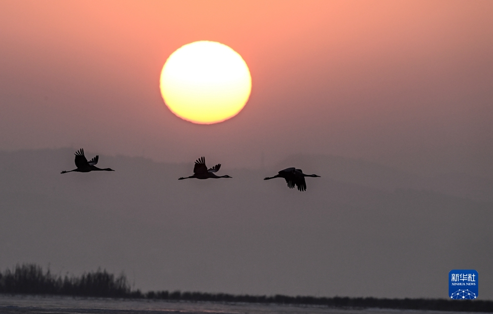 在貴州草海國家級自然保護區(qū)迎著朝陽起飛的黑頸鶴(2021年1月13日攝)。新華社記者 楊文斌 攝