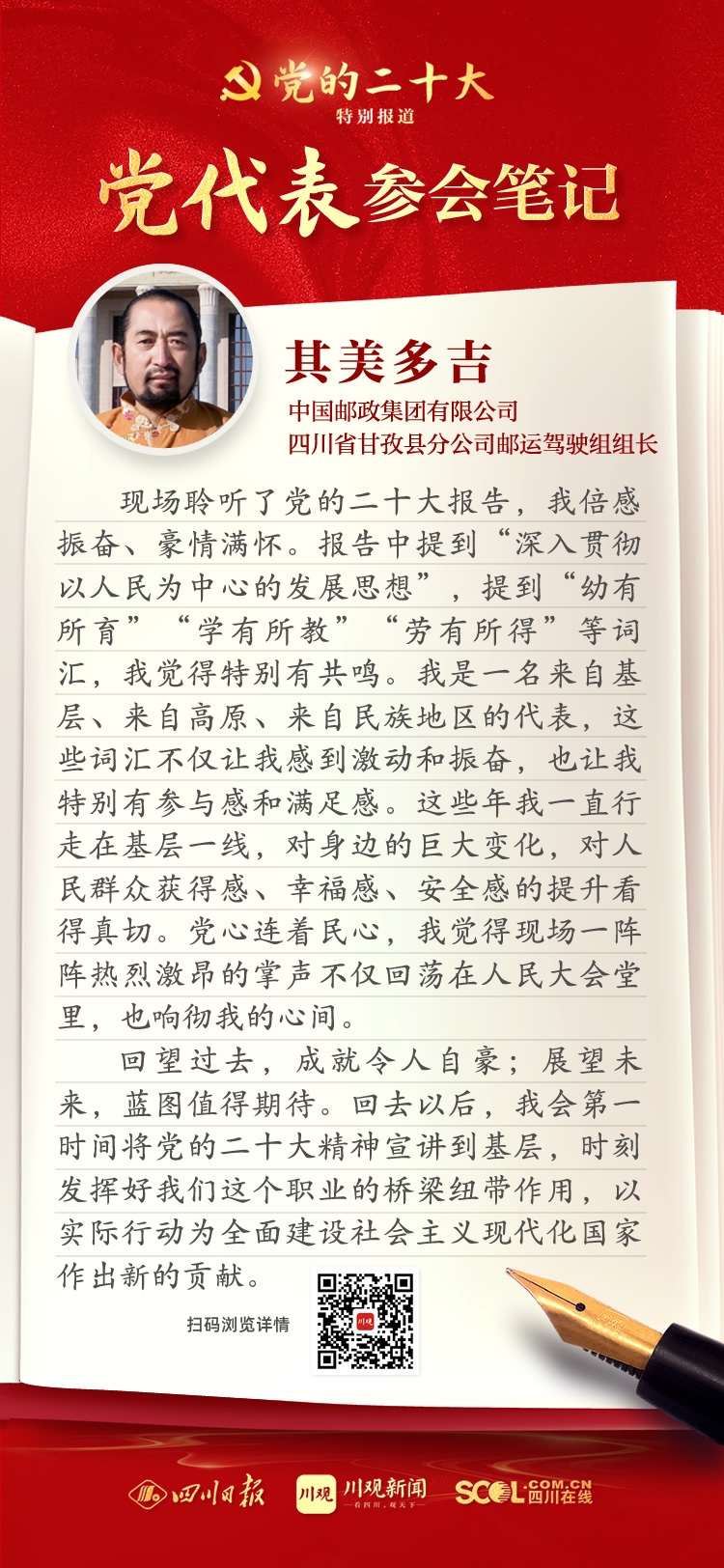 出席盛會,來自四川的黨代表深感使命光榮、責(zé)任重大,大家認(rèn)真履職,結(jié)合報告談?wù)J識、談體會、談打算。川觀新聞特此推出“黨代表參會筆記”欄目,分享黨代表們的參會心得,敬請垂注。