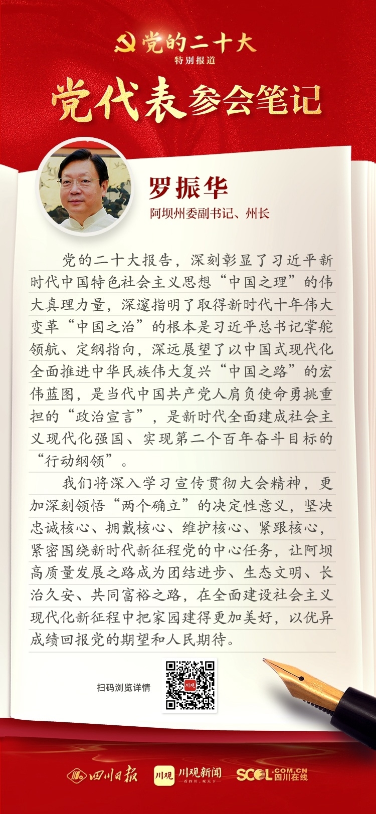 出席盛會,來自四川的黨代表深感使命光榮、責任重大,大家認真履職,結(jié)合報告談?wù)J識、談體會、談打算。川觀新聞特此推出“黨代表參會筆記”欄目,分享黨代表們的參會心得,敬請垂注。