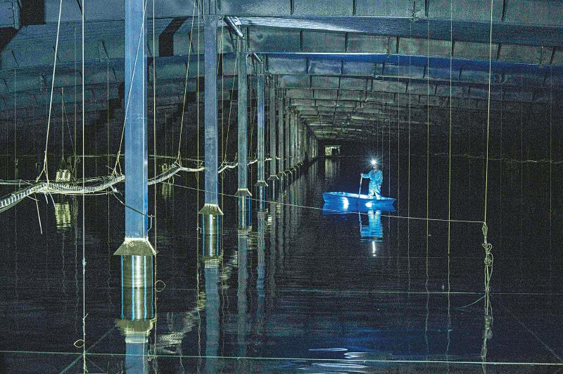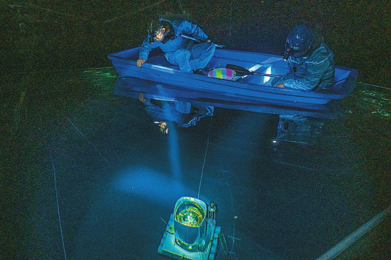 24日,陳明君和同事穿上潔凈服、戴上腳套,劃著小船進入伸手不見五指的三號水池,他們要逐一檢查維護這里的探測器單元和電子學箱。船劃到指定位置,黑暗中陳明君的頭燈光束直射水底,水下碩大的探測器單元核心設備——光電倍增管,被照得清晰可見,他和同事一起用“鉤子”把光電倍增管拉起,進行檢查?!八乩锏纳疃仁?.5米,這些純凈水的透明度比自來水高三倍以上,切倫科夫光就從里面捕獲?!标惷骶嬖V記者。