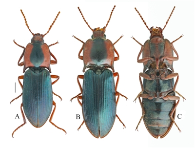 2022年6月17日,綿陽師范學院團隊來到四川省阿壩藏族羌族自治州黑水縣,開展草原有害生物普查工作。當天下午6點過,他們到達了黑水縣,在蘆花鎮(zhèn)四美村的一條土路旁,一只長相新奇的甲蟲引起了許浩的注意?!八l(fā)現(xiàn)后趕緊叫住我,甲蟲呈現(xiàn)金屬藍色光澤,在其前胸背板的兩側(cè),都有紅色斑紋,長得特別好看?!鼻聱樥f,“當時初步判斷是一個金叩甲的物種,但以前從來沒見過?!?/p>