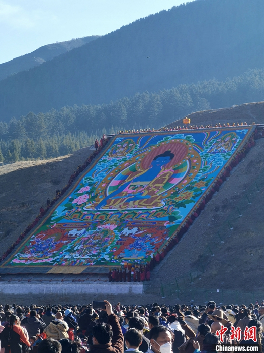 2月3日,中國(guó)農(nóng)歷正月十三,時(shí)隔三年,有“世界藏學(xué)府”之稱(chēng)的甘肅拉卜楞寺重啟“瞻佛”活動(dòng),當(dāng)日展曬的巨型唐卡佛像吸引7萬(wàn)余僧俗民眾慕名瞻仰,祈禱新年風(fēng)調(diào)雨順、國(guó)泰民安。中新社發(fā) 屈鵬 攝