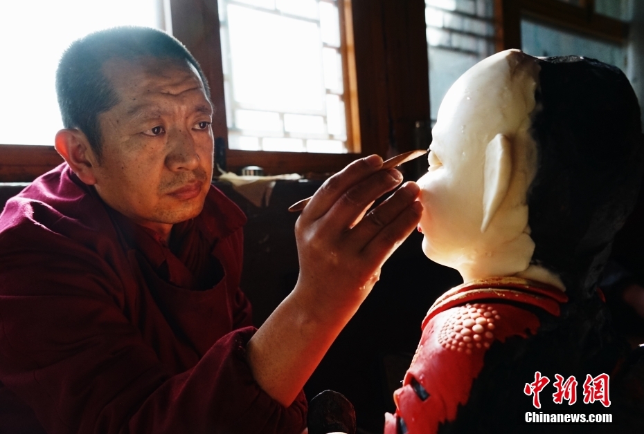 2月1日,在位于青海省西寧市湟中區(qū)境內(nèi)的藏傳佛教名剎塔爾寺內(nèi),藝僧正在制作酥油花。