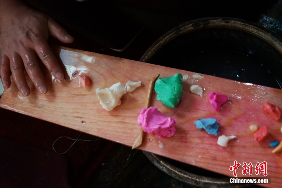 2月1日,在位于青海省西寧市湟中區(qū)境內(nèi)的藏傳佛教名剎塔爾寺內(nèi),藝僧搓揉酥油成條狀。