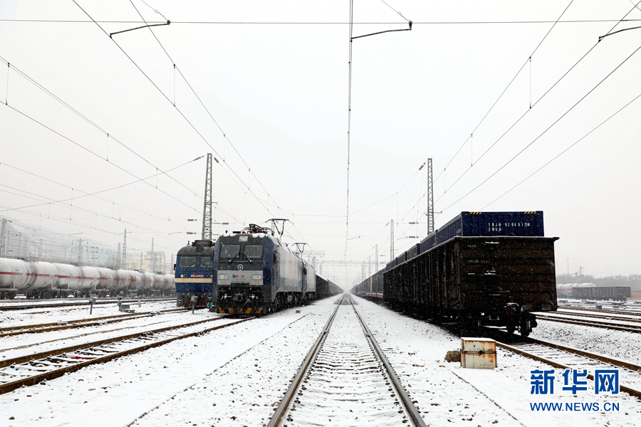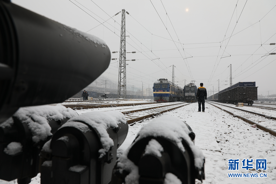 列檢人員在雪中等待列檢。新華網 鐵萬鋼 攝