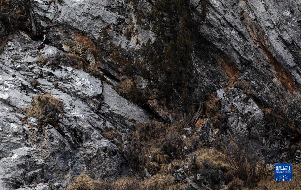 2月21日,在青海省玉樹藏族自治州雜多縣昂賽鄉(xiāng)境內(nèi)的昂賽大峽谷內(nèi),一只雪豹在向上攀爬。新華社記者 費茂華 攝