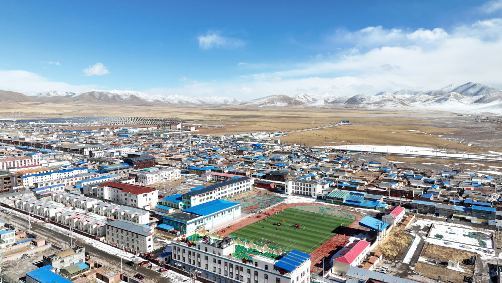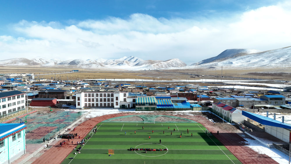 3月1日,在玉樹州曲麻萊縣,曲麻萊縣第一完全小學(xué)學(xué)生在足球課上(無人機(jī)照片)。新華社記者 張宏祥 攝