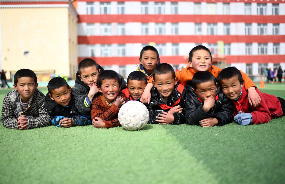 3月1日,在玉樹州治多縣,吉尕小學(xué)二年級(jí)學(xué)生才仁巴?。ㄗ笏模┖托』锇閭?cè)趯W(xué)校的球場(chǎng)上。新華社記者 張宏祥 攝