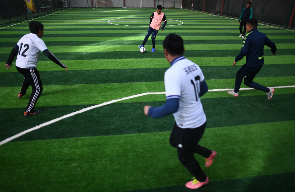 3月2日,在玉樹州玉樹市一處室內(nèi)球場(chǎng),幾名足球愛好者正在踢球。新華社記者 張宏祥 攝