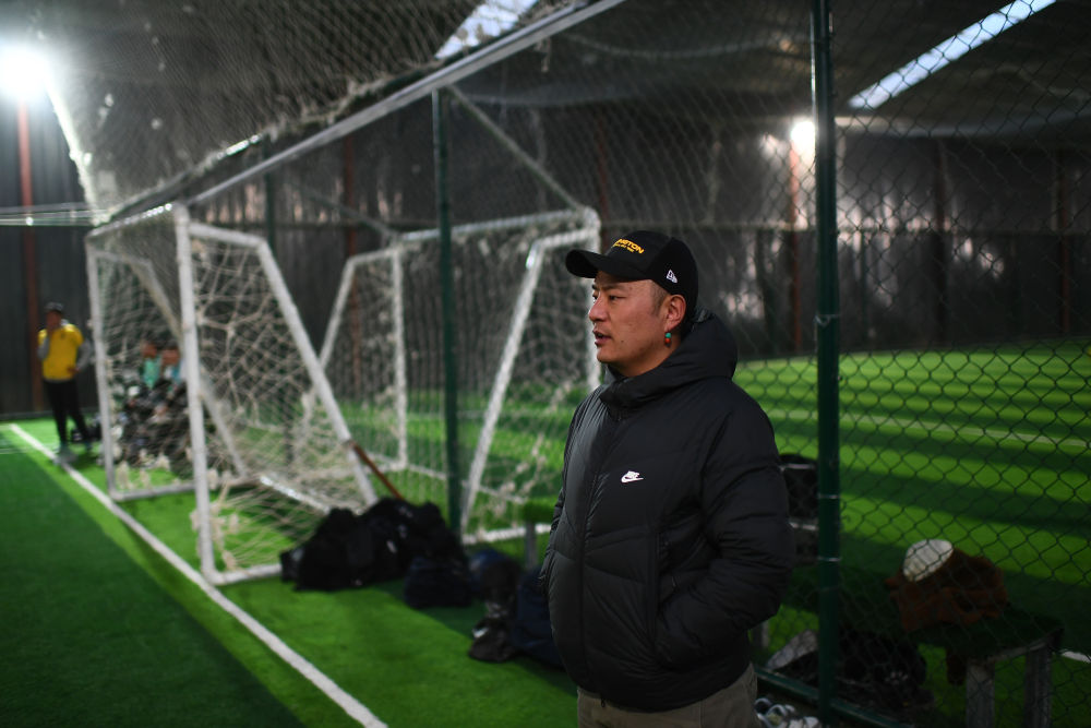 3月2日,在玉樹州玉樹市一處室內(nèi)球場(chǎng),玉樹康巴野牦牛足球隊(duì)領(lǐng)隊(duì)格萊永培觀看比賽。新華社記者 張宏祥 攝