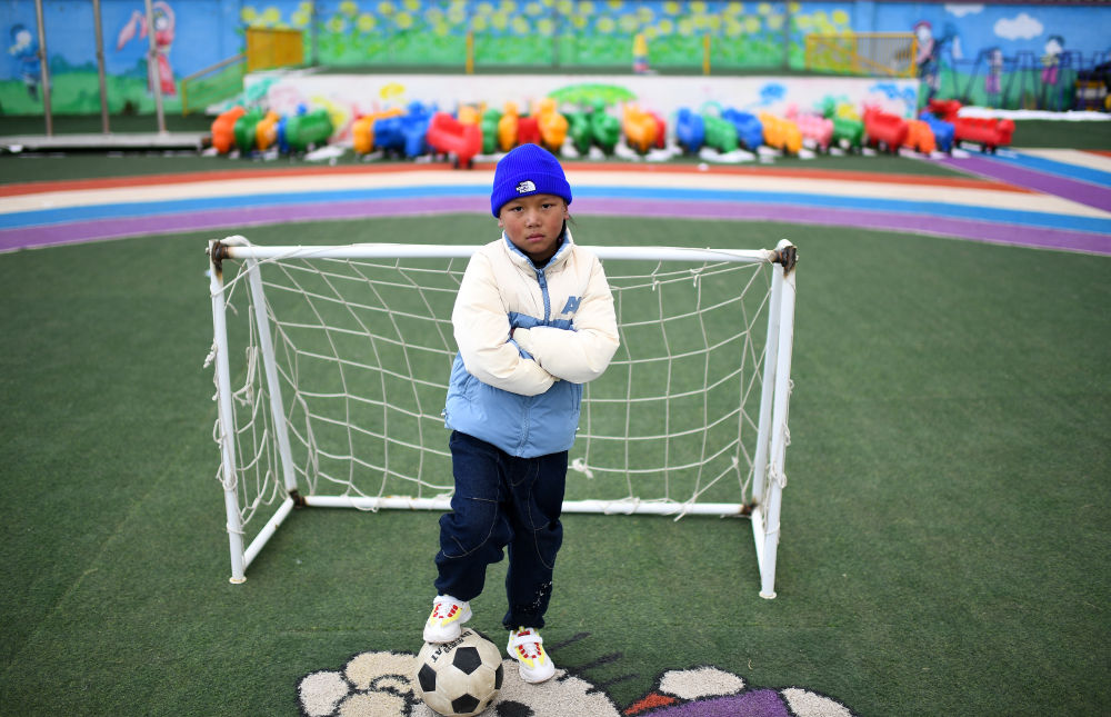 3月1日,在玉樹州治多縣,城南幼兒園小朋友桑周尼瑪(前)在練習(xí)射門。新華社記者 張宏祥 攝