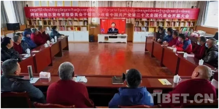 圖為阿壩州格爾登寺管理委員會干部增人觀看黨的二十大開幕式
