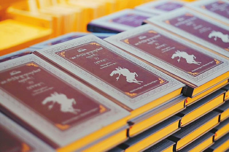 《格薩爾王全集》的裝幀,封面是比較特別的,有云紋做背景,書的背脊,一邊是書名和編號,另一邊是由十余幅格薩爾唐卡拼接而成,書頁上端的空白和紙邊之間采用了金色滾邊的工藝。[詳細(xì)] -