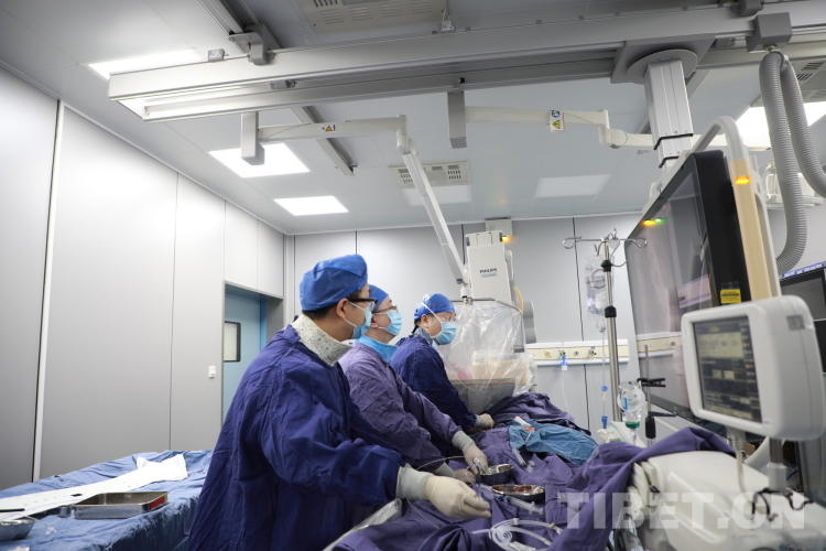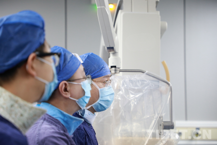 圖為北醫(yī)三院院長助理唐熠達(dá)教授(右一)帶領(lǐng)專家團(tuán)隊在為來自青海省果洛藏族自治州的先心病患兒手術(shù)時觀察導(dǎo)管行進(jìn)情況 攝影:劉莉