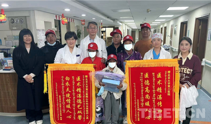 圖為3名來自青海省果洛藏族自治州的先心病患兒及患兒家屬等向北醫(yī)三院敬贈錦旗 攝影:宮禧