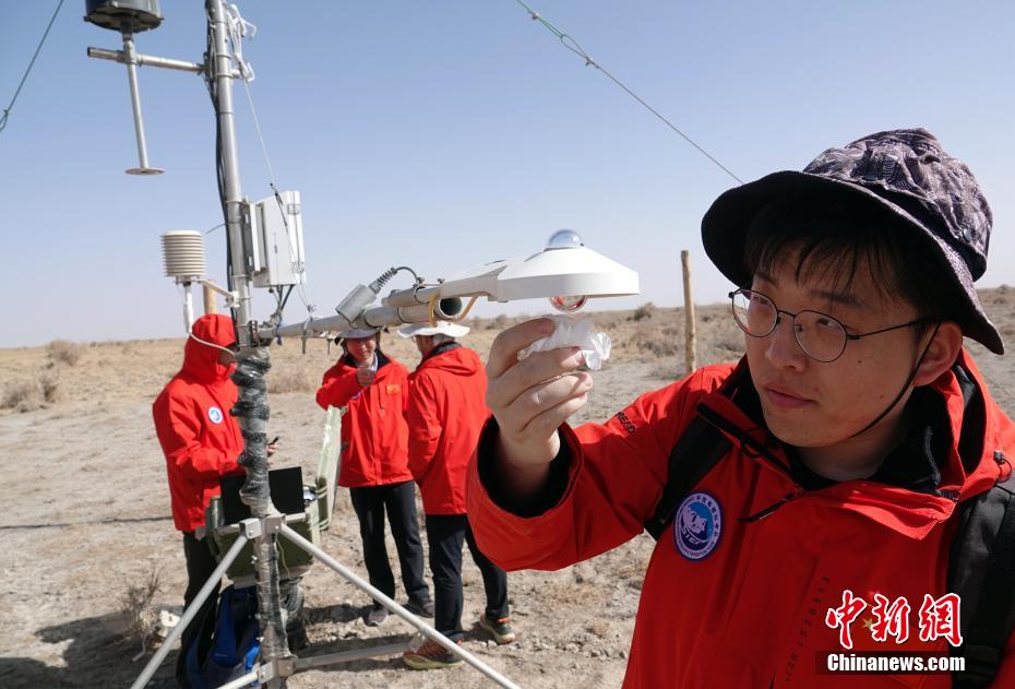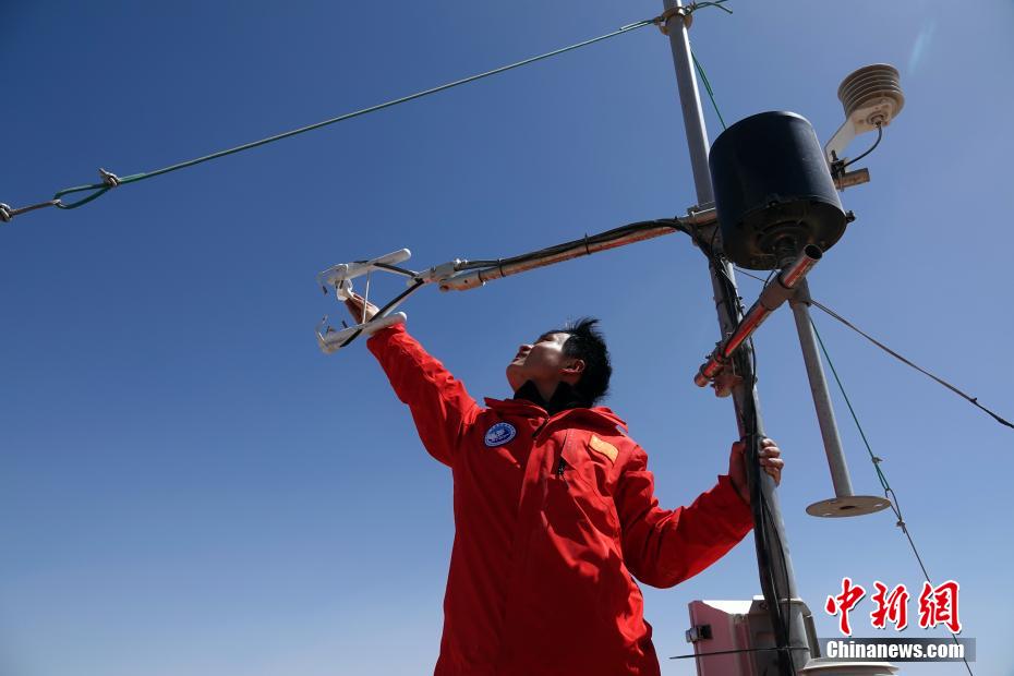 第二次青藏科考隊(duì)員、中科院空天院博士生呂云哲在觀測站現(xiàn)場維護(hù)擦拭觀測設(shè)備探頭。中新社記者 孫自法 攝