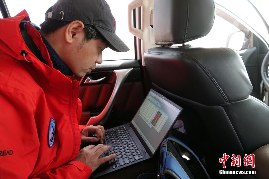 觀測站現(xiàn)場,第二次青藏科考隊(duì)員、中科院空天院鄭超磊副研究員隨即在車上進(jìn)行數(shù)據(jù)初步檢查處理工作。中新社記者 孫自法 攝
