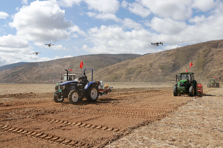 隨著一聲擲地有聲的“開(kāi)耕……”,十余輛大型農(nóng)機(jī)具緩緩入地,現(xiàn)場(chǎng)為大家展示了青稞全程機(jī)械化作業(yè)。20臺(tái)免耕播種機(jī)、約翰迪爾1354輪式拖拉機(jī)等機(jī)具在農(nóng)機(jī)手熟練操控下,旋耕、播種、覆土、鎮(zhèn)壓一次完成,無(wú)人機(jī)飛舞在天空,噴灑著農(nóng)藥,一幅現(xiàn)代版鐵?!按焊备?jìng)技圖躍入眼簾,在場(chǎng)人員紛紛掏出手機(jī)、相機(jī)拍攝記錄下這富有“科技感”的畫(huà)面。