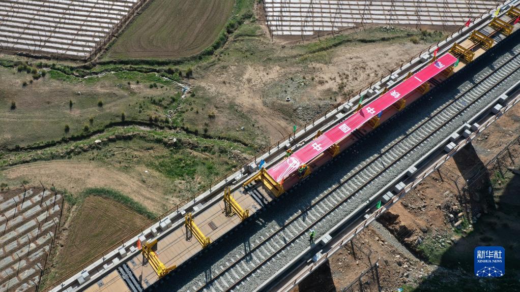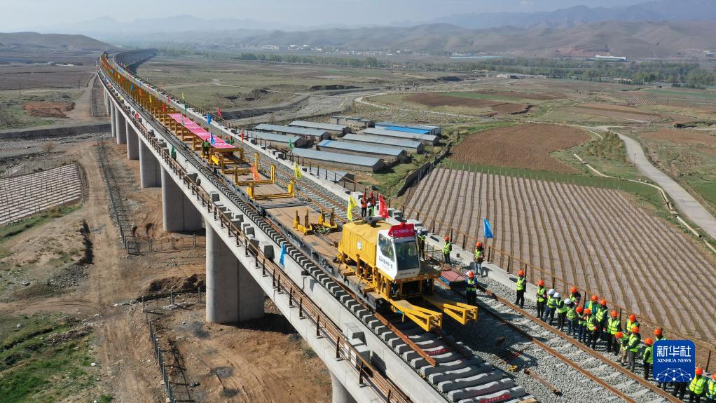 這是5月26日拍攝的中鐵一局蘭張三四線鐵路下河?xùn)|特大橋鋪軌作業(yè)現(xiàn)場(chǎng)。新華社記者 陳斌 攝