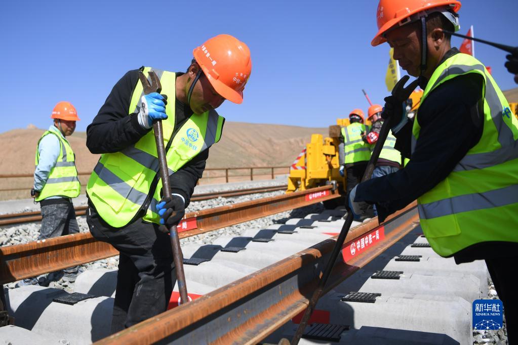 5月26日,中鐵一局施工人員在蘭張三四線鐵路下河?xùn)|特大橋鋪軌施工現(xiàn)場(chǎng)作業(yè)。新華社記者 陳斌 攝