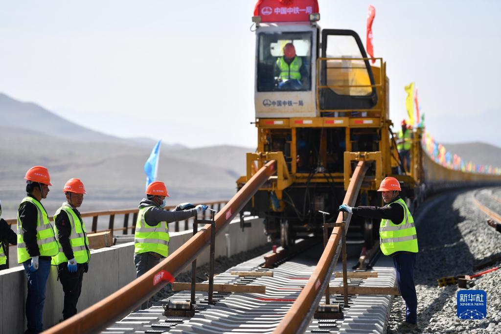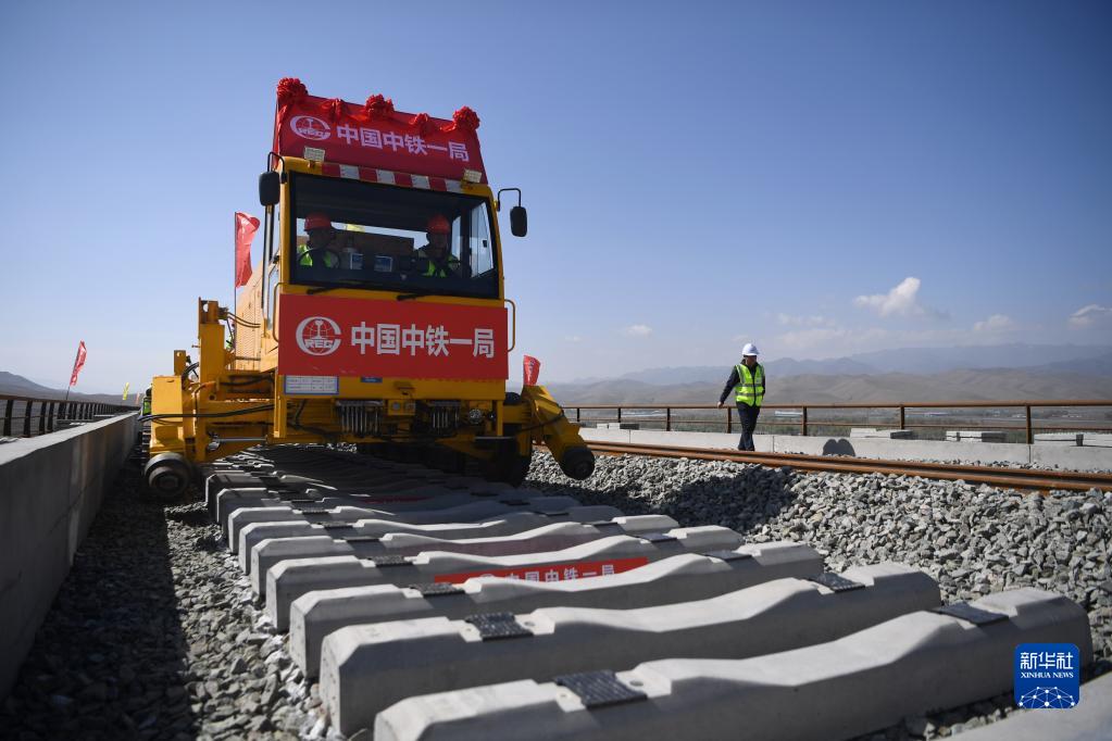 5月26日,在甘肅省武威市天祝藏族自治縣境內(nèi)蘭(蘭州)張(張掖)三四線鐵路鋪軌施工現(xiàn)場(chǎng),一體式牽引車在中鐵一局施工人員的操作下,將一組500米長(zhǎng)的鋼軌精準(zhǔn)鋪設(shè)在道床上,標(biāo)志著由中鐵一局承建的蘭張三四線鐵路蘭州至武威段進(jìn)入全線鋪軌階段。