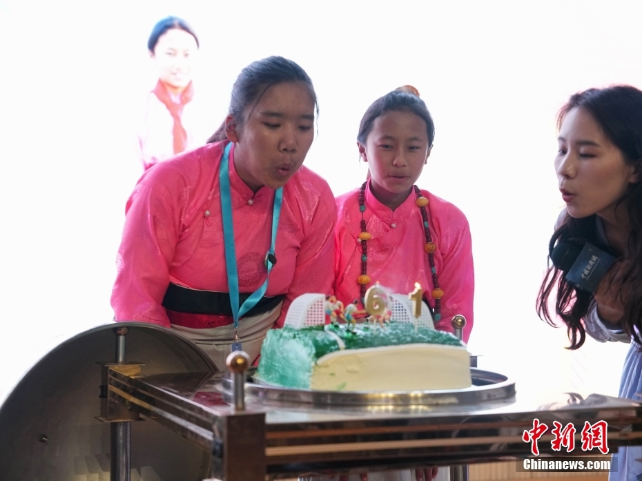 圖為藏族孩子鬧增拉毛(左)、卓尕才仁(右)共同吹滅蠟燭。中新社記者 崔楠 攝