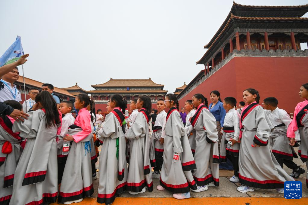 5月31日,來(lái)自青海省玉樹(shù)州的孩子們?cè)诒本┕蕦m博物院外排隊(duì)等候進(jìn)入?yún)⒂^。新華社記者 陳曄華 攝