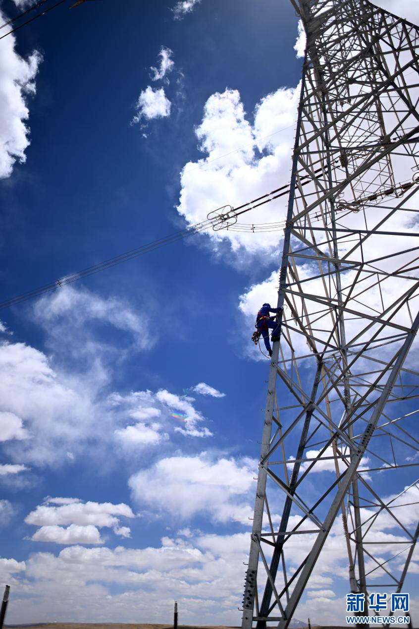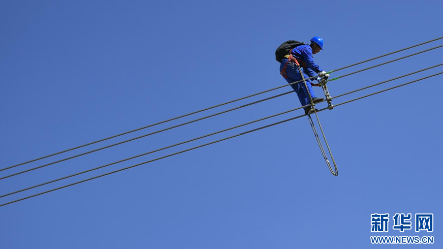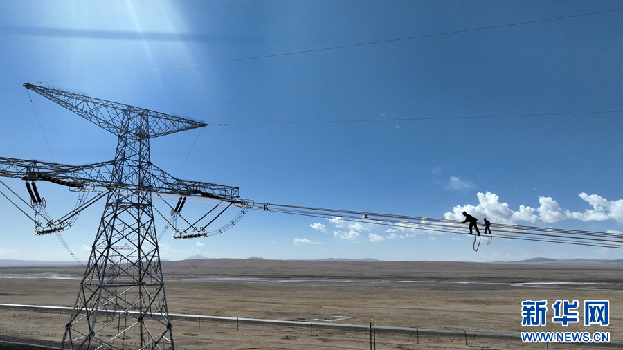 在平均海拔超過4500米的長江源頭腹地,檢修人員克服高寒缺氧的環(huán)境,在云端走線巡檢,成為“電力天路”一道獨(dú)特的風(fēng)景。新華社記者 張宏祥 攝