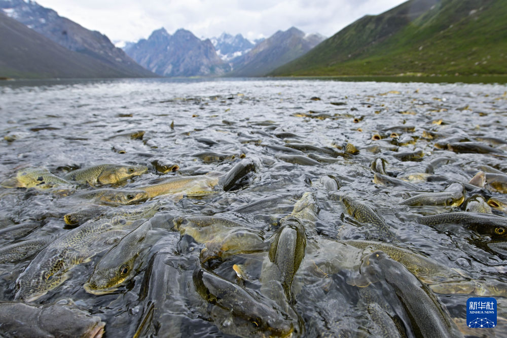 6月11日,在青海省果洛藏族自治州久治縣境內的年保玉則,裸鯉在水中活動。新華社記者 張龍 攝