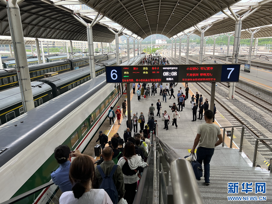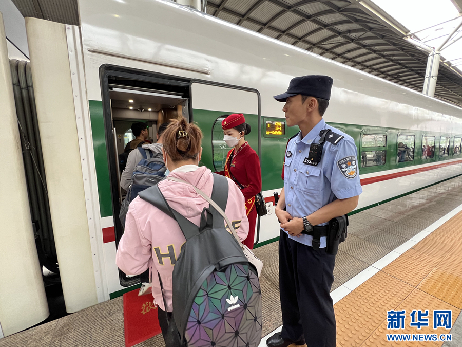 7月1日,工作人員在站臺上為出行旅客提供服務。新華網(wǎng) 魚昊 攝