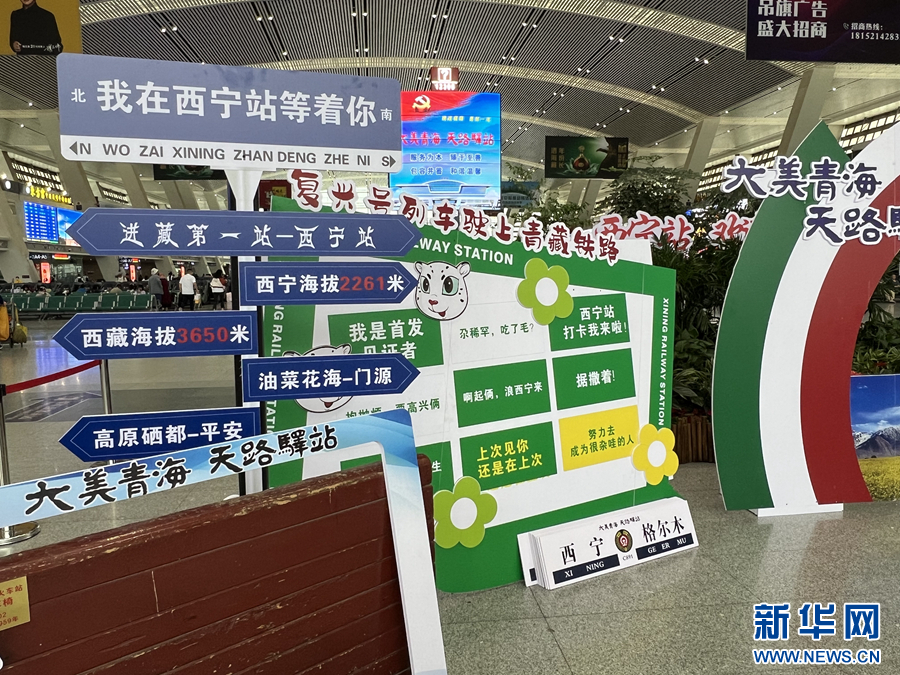 7月1日,在西寧火車站候車大廳,工作人員設置了拍照打卡點。新華網(wǎng) 魚昊 攝