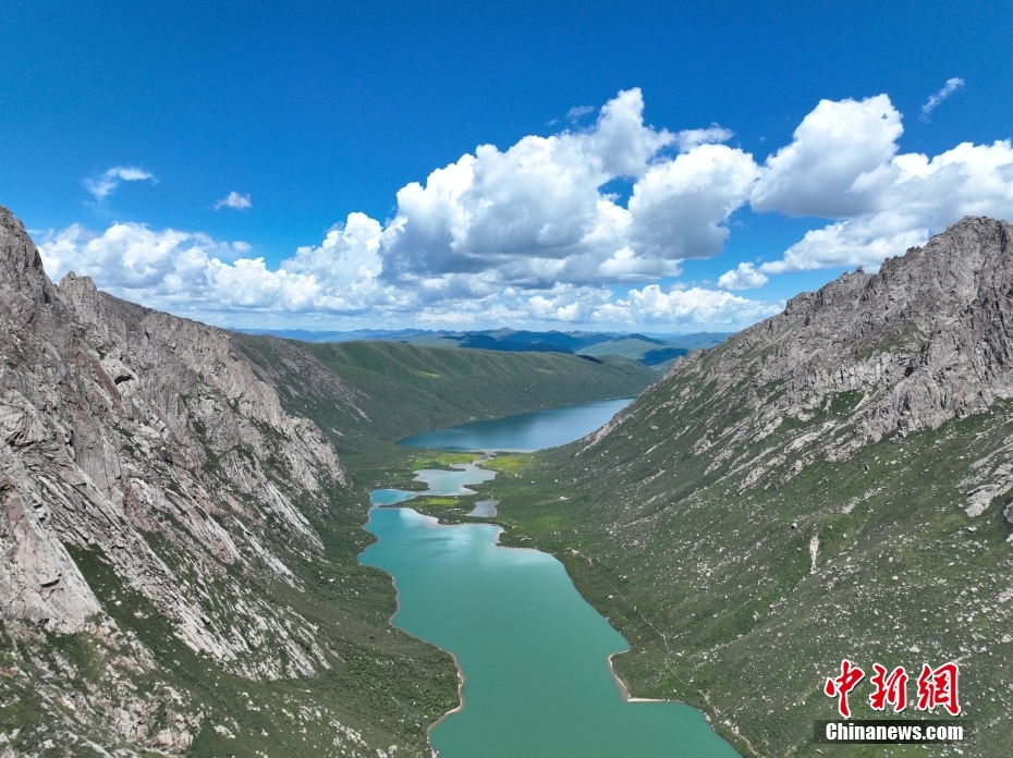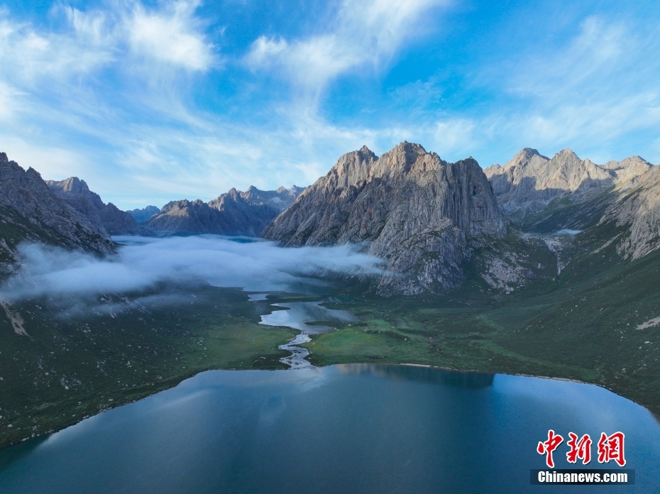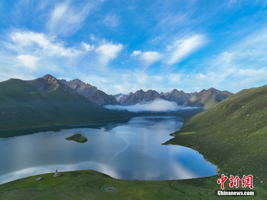 7月19日,盛夏時(shí)節(jié),青海省果洛藏族自治州久治縣年保玉則山間云霧繚繞,山下鮮花盛開,水清草豐,靜謐的湖水與嶙峋的山巒相映成趣,宛如仙境。年保玉則總面積3469平方公里,山形如蓮花,保存有冰蝕地貌、冰磧地貌、現(xiàn)代冰川等地質(zhì)遺跡。(無人機(jī)照片)中新社記者 馬銘言 攝