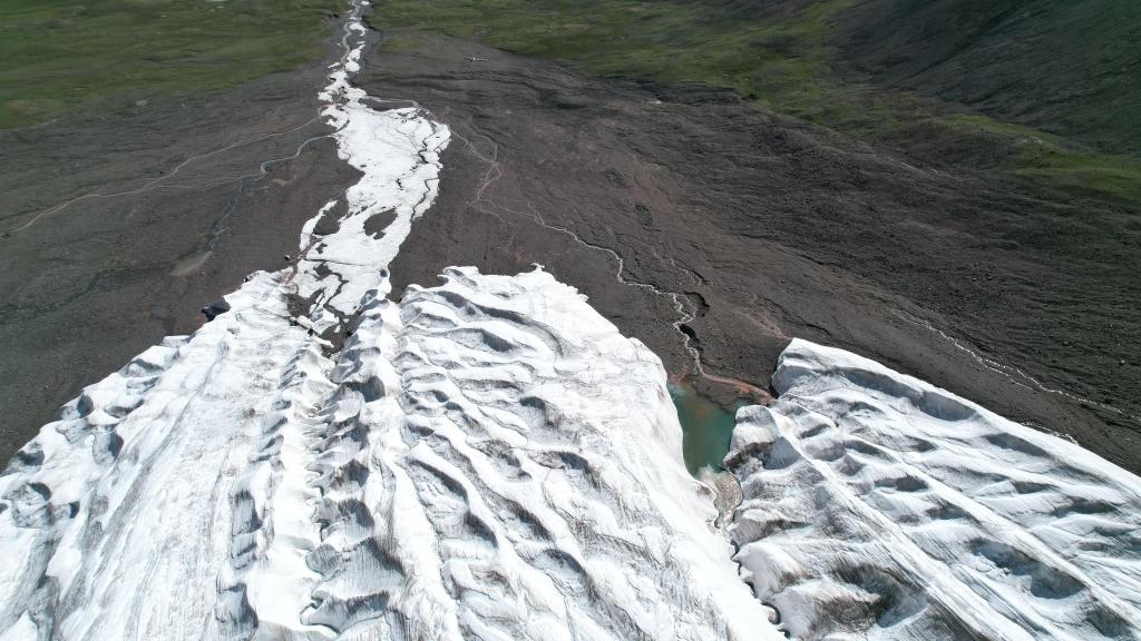 2022年江源綜合科學考察隊曾對此冰川進行地質(zhì)雷達探測,通過布設一維測線獲取冰川前緣的冰厚數(shù)據(jù),以及冰下地形走勢。今年在相同位置進行探測,增加了兩個二維測網(wǎng)的布設,獲取的數(shù)據(jù)用于對比一年來冰川前緣冰厚和冰下地形的變化,計算測網(wǎng)內(nèi)準確的冰儲量,揭示氣候變化對冰川退化的影響,以及冰川運動對于冰下基巖的剝蝕特征。