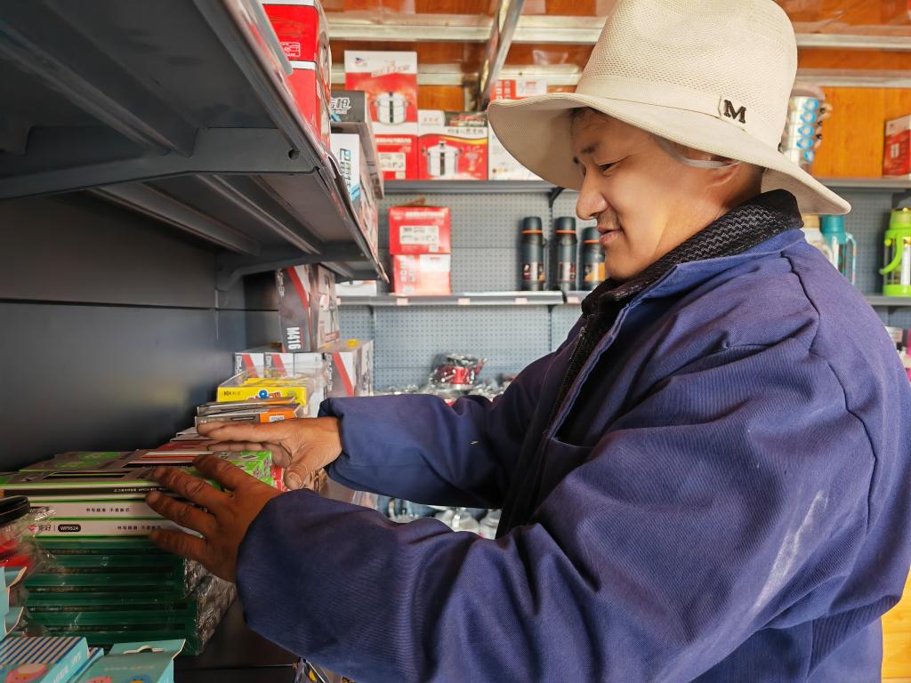 7月27日,“綠色超市”管理員達(dá)桑正在整理貨架。新華社記者 周盛盛 攝